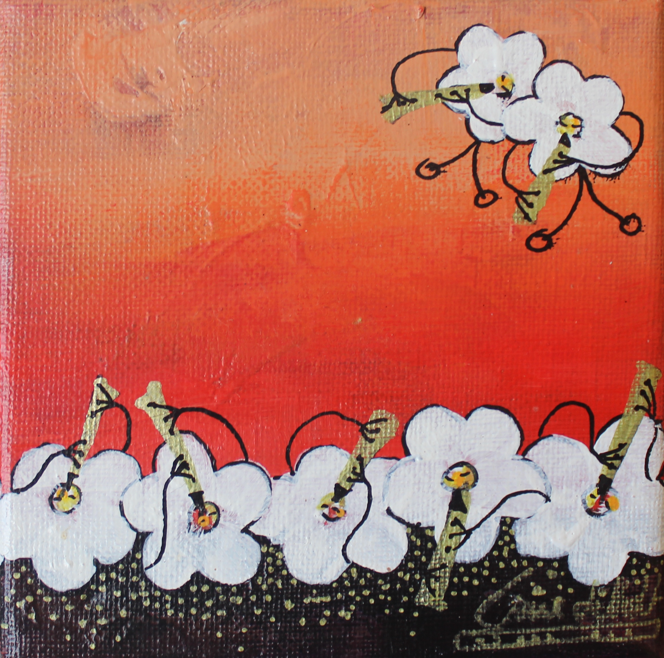 Akrylmaleri 12 x 12 cm. Orange farver. Før 475 kr. Nu 275 kr.Slutspurt 200 kr. Solgt.