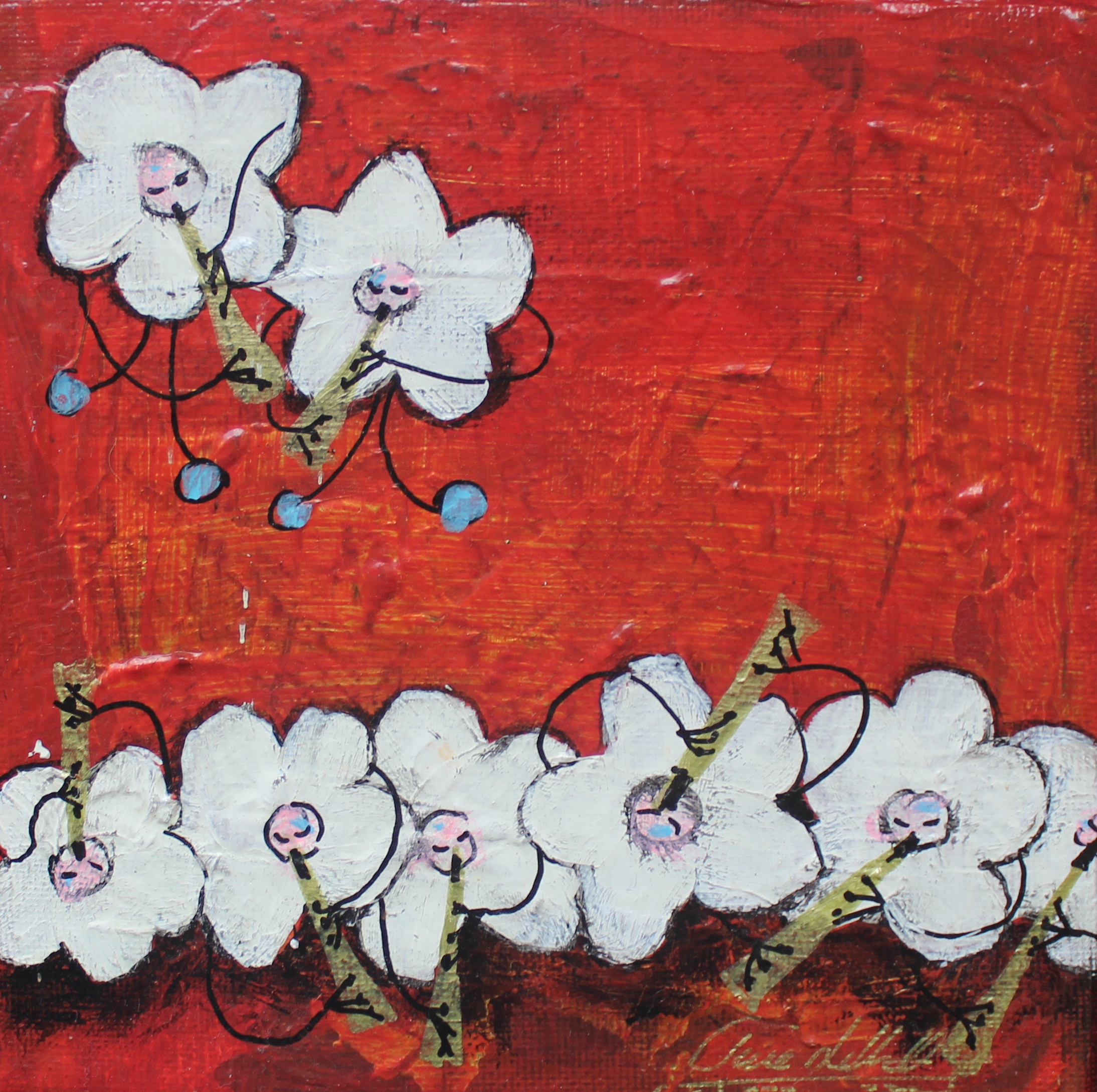 Akrylmaleri 15 x 15 cm. Røde og hvide farver. Før: 775 kr. Nu: 375 kr. Slutspurt 275kr. Solgt.