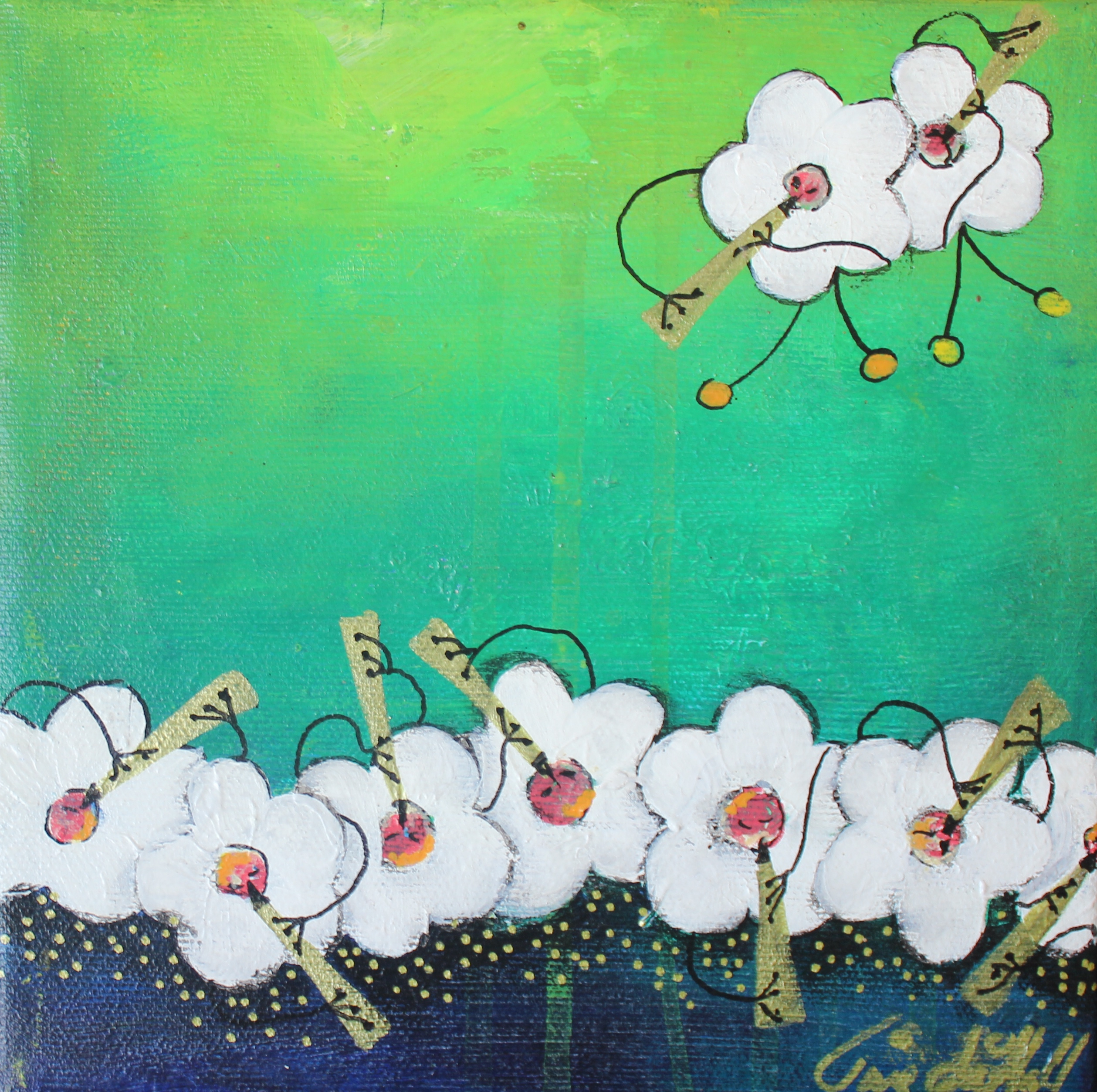 Akrylmaleri 20 x 20 cm i sølv svæverammer.