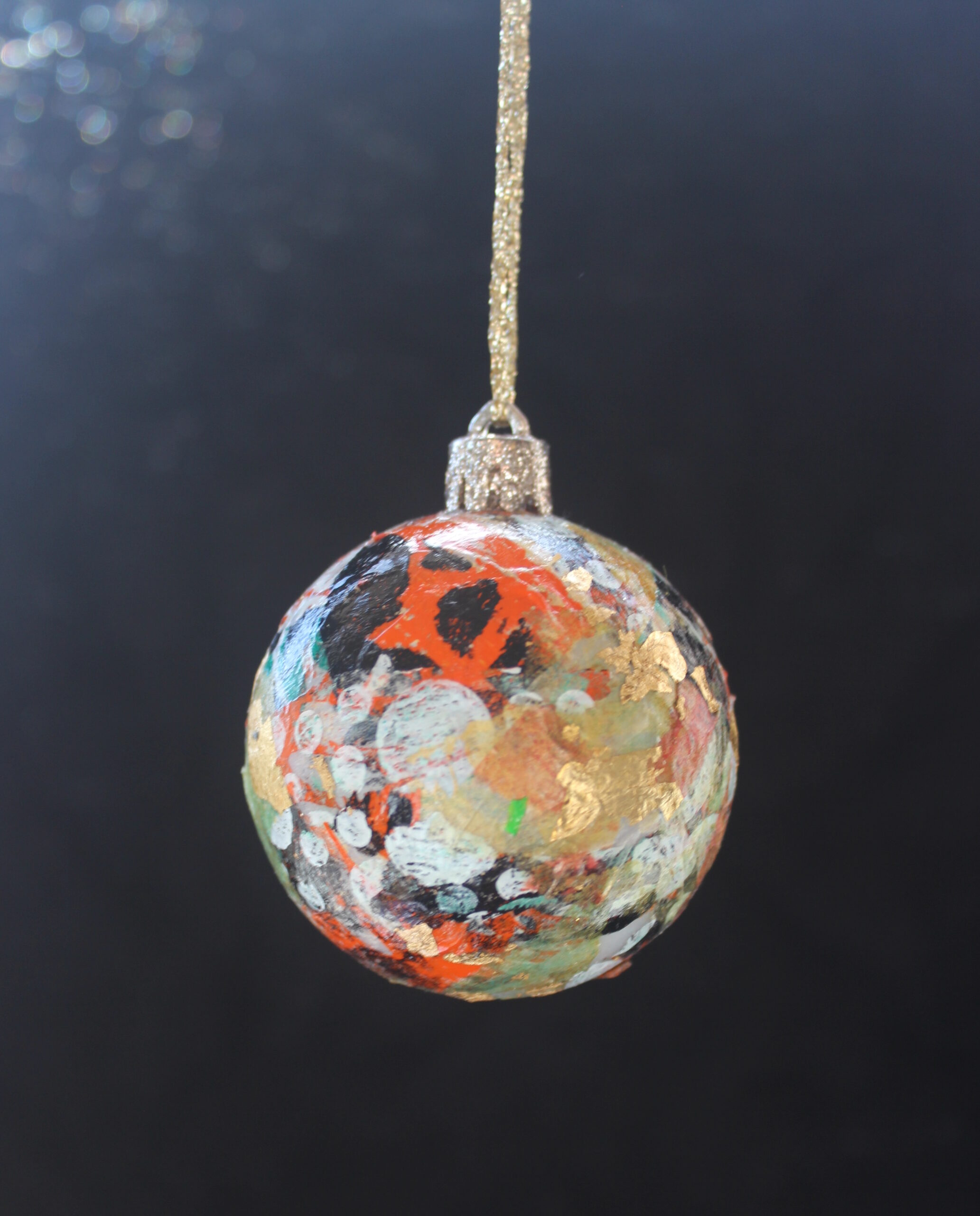 Julekugle. Plast. 6 cm. Dekoreret med Gelli printet silkepapir.