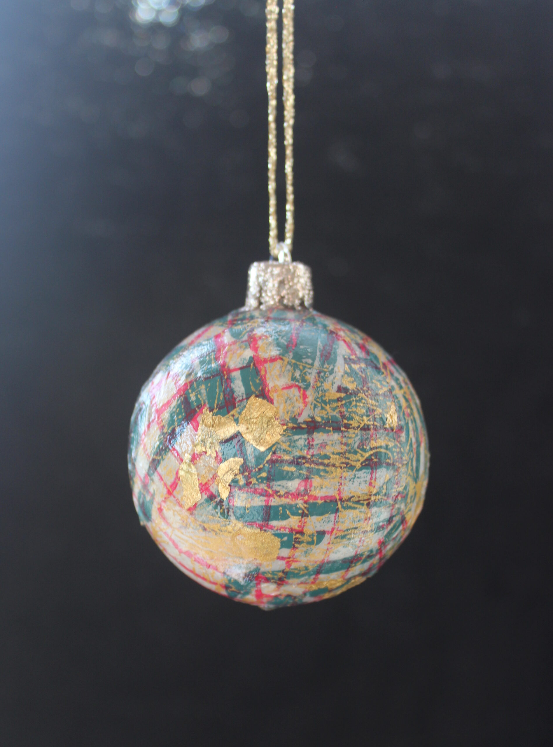 Julekugle. Plast. 6 cm. Dekoreret med Gelli Printet silkepapir.